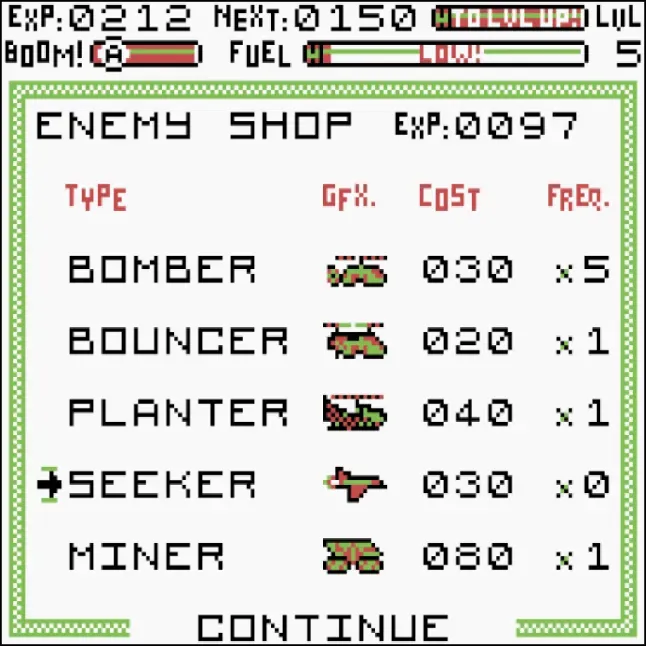 IndestructoTank! ist ein Spiel im Arcade-Stil, das das klassische Flash-Spiel auf deinen Game Boy bringt. Du springst zerstörerisch über Hubschrauber, Flugzeuge und mehr und versuchst, hohe Combos zu erzielen und Punkte zu sammeln, die du für Upgrades ausgeben kannst. Steig in den IndestructoTank! und mach dich bereit für einen Ritt!