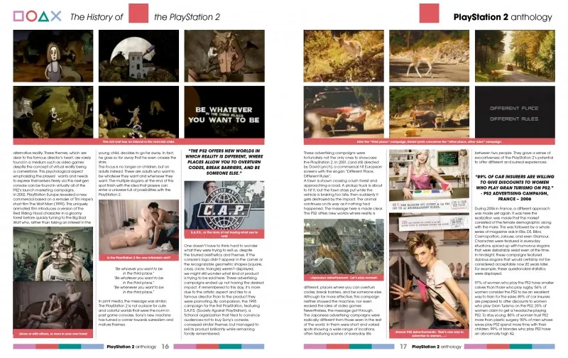 Das Geschichtskapitel setzt dort an, wo Band 1 aufgehört hat – vom Launch in Japan, den USA und Europa bis zur Positionierung gegen Xbox und GameCube. Besonders beleuchtet wird der Einfluss des integrierten DVD-Players als Kaufargument sowie die provokanten Werbekampagnen unter der Regie von David Lynch.