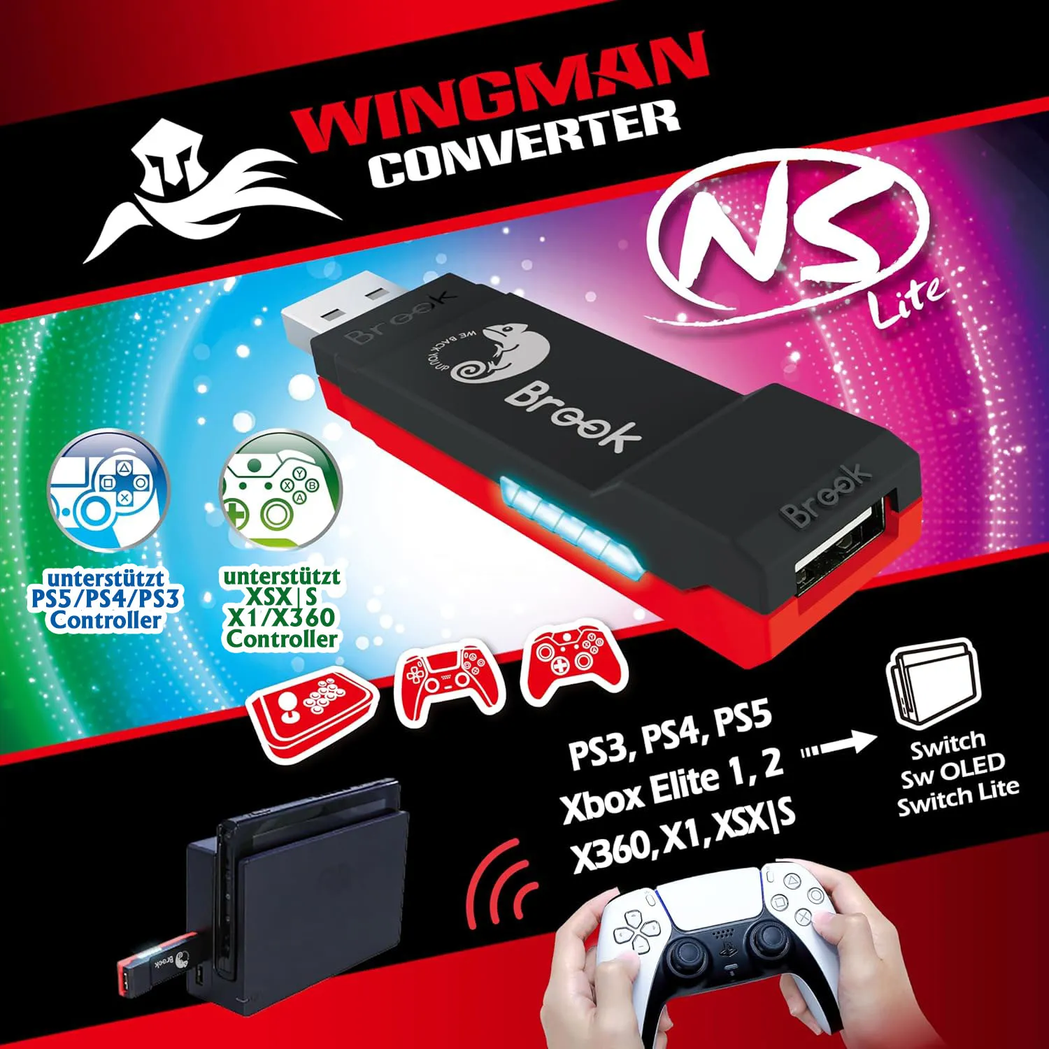 Wingman NS Lite ist ein führendes Beispiel für die Kompatibilität von kabelgebundenen Controllern und unterstützt über 150 kabelgebundene und kabellose Controller von offiziellen Herstellern und Drittherstellern. Dieser Konverter ermöglicht nahtlose Verbindungen und befreit dich von der Beschränkung auf einen einzigen kabelgebundenen Controller und bietet mehr Flexibilität und Freiheit.
